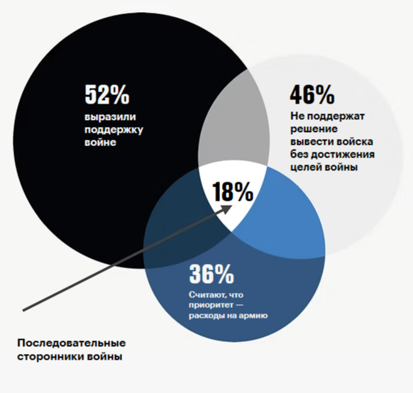 Поэтому важно знать, что такие группы есть, видеть их и оценивать их масштаб, но надо понимать, что каждая из них — это меньшинство в районе 18-20% населения. А основная динамика касается оставшихся 60% населения. И тут мы как раз можем говорить про очевидный рост запроса на мир и прекращение войны.