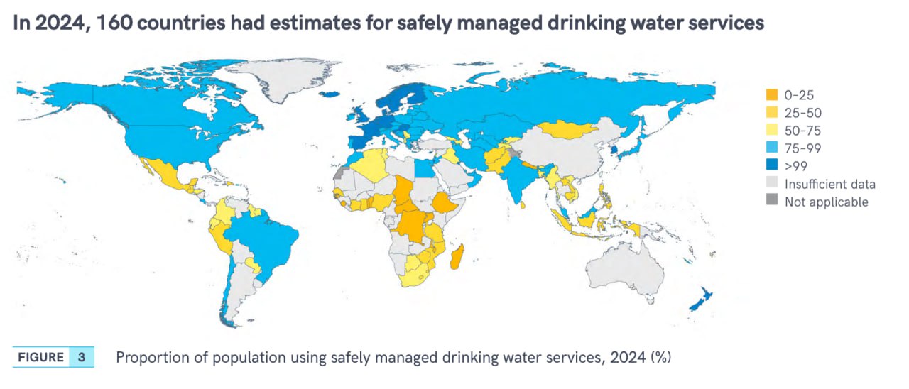В то же время в странах северной и западной Европы показатель доступа к безопасной питьевой воде составляет 100% или близок нему. Критерий доступа, согласно Всемирной организации здравоохранения, — это улучшенные источники воды, расположенные по месту жительства, доступные по мере необходимости и свободные от загрязняющих веществ.