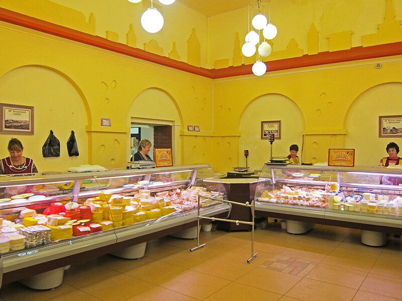 Таксист Николай сразу сказал: за сыром идите на «Сырную биржу» (ул. Мучные Ряды, 1) — дешевле и выбор огромный. Народ здесь толпится с самого утра, а витрины завалены большими головами самых популярных сортов сыра: Гауда, Российский, Тильзитер, Пошехонский и еще десяток других. Есть сыры с локальными названиями «Сусанин» и «Романов». Очень хвалят костромской раклет, особенно под белое вино. Из необычного — сырные рулеты с зеленью, черносливом и орехами.