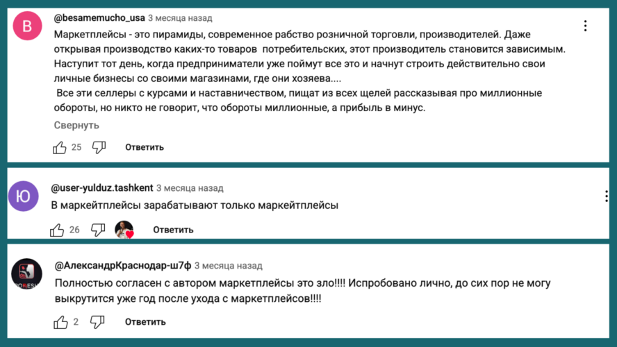 На ярких и завлекающих обложках видео — счастливые блогеры-эксперты по торговле на Wildberries, Ozon и других маркетплейсах. Их ролики с рассказами, как заработать свой первый миллион, каких ошибок не допустить и как выбрать товар, который точно все захотят купить, собирают сотни тысяч просмотров. Предприниматели разного калибра активно обсуждают свои успехи в комментариях у лидеров мнений или в профессиональных сообществах для селлеровТак называют предпринимателей, которые продают товары на маркетплейсе..