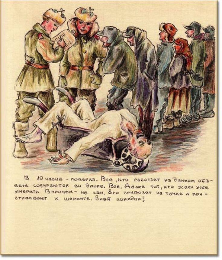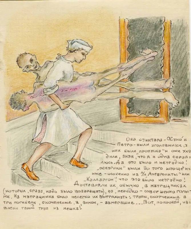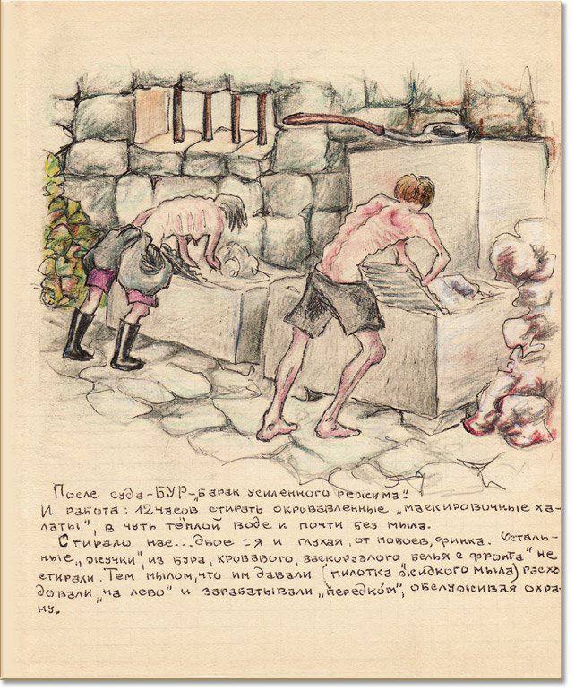 И уже после всего, в 1960-х годах, перебравшись в Ессентуки, она решила написать книгу о своей жизни. Точнее нарисовать. И в итоге получился страшный комикс. Несколько сотен картинок с подписями, иногда обширными, иногда короткими, о лагерных буднях.