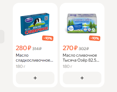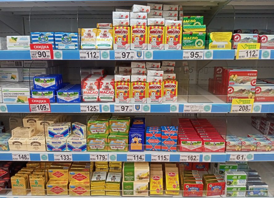 Впрочем, даже эти драматичные цифры не отражают реальности. В самых массовых и народных сетях — «Пятерочка» и «Магнит» — самое дешевое масло даже со скидками стоит сейчас больше 1200 рублей за килограмм (220 рублей за пачку 180 грамм). Речь идет о более-менее надежных брендах, которые соблюдают ГОСТ и не добавляют в масло трансжиры и о масле 85,5 %. В масле 72,5% — «Крестьянском» (название по ГОСТу), в лучшем случае просто меньше масла, но, вероятнее всего, всевозможные добавки.