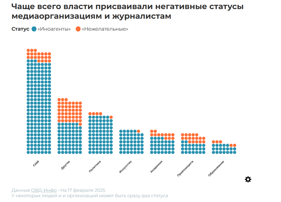 Из-за войны власти присвоили негативные статусы 557 людям и организациям. Большинство из них — «иностранные агенты» (444), остальные 107 — признаны нежелательными. Чаще всего такие статусы получали медиаорганизации и журналисты. По политически мотивированным антивоенным уголовным делам в заключении находятся 38 журналистов и блогеров.